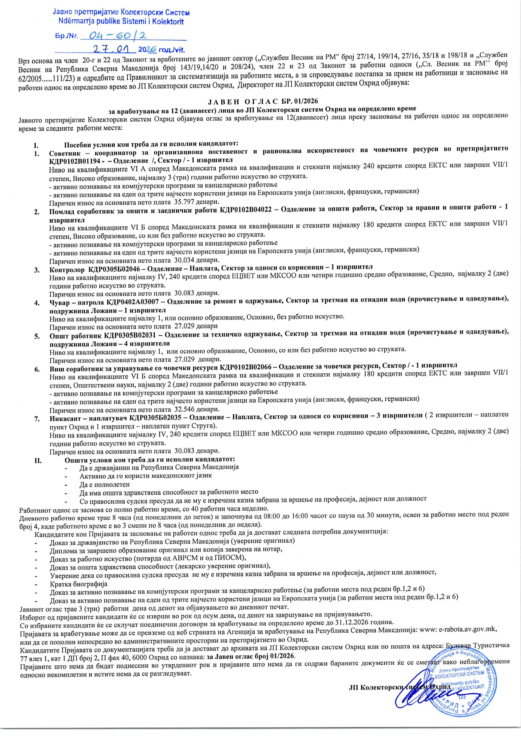 Oдлуката за јавниот оглас бр.02/2025 за работно место Инкасант-Наплатувач Охрид link